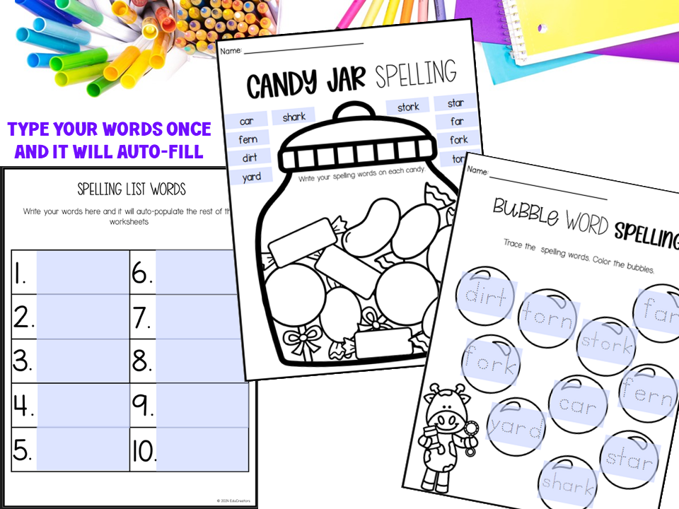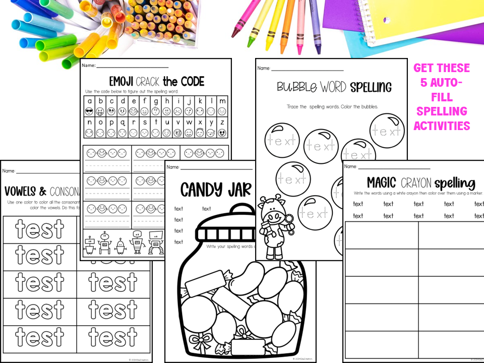 Editable or Auto-filled spelling activities that work for any list! Spelling activities that have fun and engaging elements to add addresses these common challenges by providing a versatile and engaging way to practice spelling.